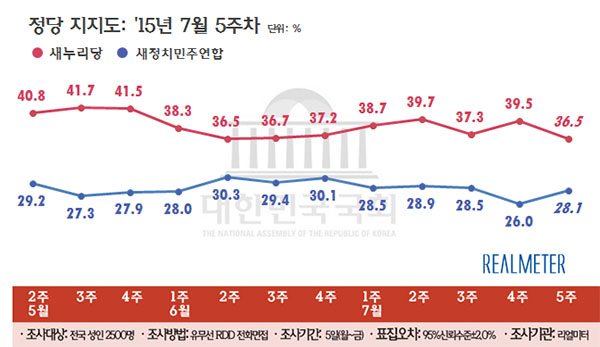 ¡ß »õ´©¸®´ç 36.5%(¡å3.0%p), »õÁ¤Ä¡¿¬ÇÕ 28.1%(¡ã2.1%p), Á¤ÀÇ´ç 5.5%(¡ã0.5%p)