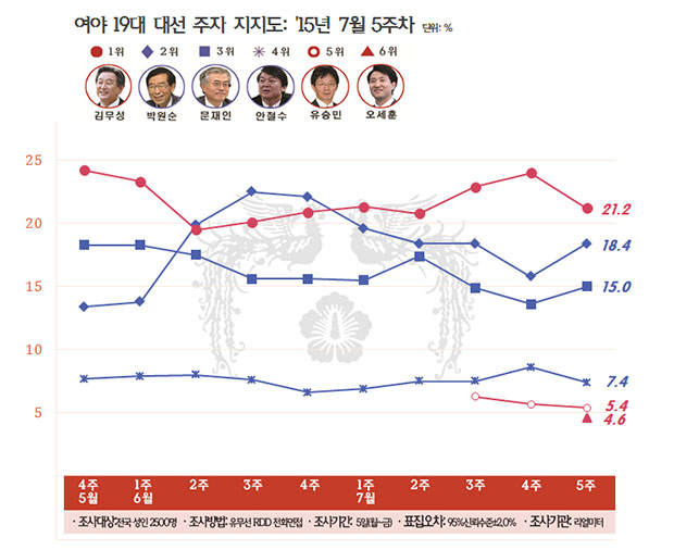 ¡ß ±è¹«¼º 21.2%(¡å2.8%p), ¹Ú¿ø¼ø 18.4%(¡ã2.6%p), ¹®ÀçÀÎ 15.0%(¡ã1.4%p)
