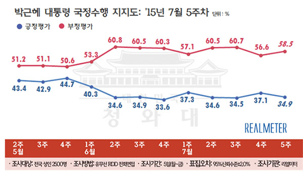 ¿©·ÐÁ¶»ç Àü¹®±â°ü ¸®¾ó¹ÌÅÍÀÇ 7¿ù 5ÁÖÂ÷(27~31ÀÏ) ÁÖ°£Áý°è¿¡¼, ¹Ú±ÙÇý ´ëÅë·ÉÀÇ ±¹Á¤¼öÇà ÁöÁöµµ(±àÁ¤Æò°¡)´Â 1ÁÖÀÏ Àü ´ëºñ 2.2%p Ç϶ôÇÑ 34.9%(¸Å¿ì ÀßÇÔ 9.7%, ÀßÇÏ´Â Æí 25.2%)¸¦ ±â·ÏÇß°í, '±¹Á¤¼öÇàÀ» À߸øÇϰí ÀÖ´Ù'´Â ºÎÁ¤Æò°¡´Â 1.9%p »ó½ÂÇÑ 58.5%(¸Å¿ì À߸øÇÔ 38.8%, À߸øÇÏ´Â Æí 19.7%)¸¦ ±â·ÏÇß´Ù. ºÎÁ¤Æò°¡¿Í ±àÁ¤Æò°¡ °ÝÂ÷´Â 19.5%p¿¡¼ 4.1%p ¹ú¾îÁø 23.6%p·Î Áý°èµÆ´Ù. '¸ð¸§/¹«ÀÀ´ä'Àº 0.3%p Áõ°¡ÇÑ 6.6%.