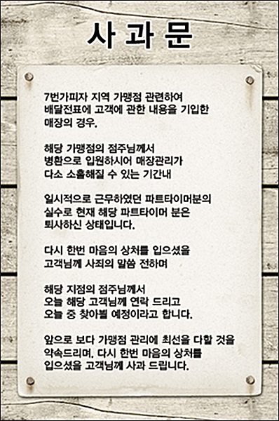 ÀÌ¿¡ 7¹ø°¡ÇÇÀÚÃøÀº 2ÀÏ È¨ÆäÀÌÁö¸¦ ÅëÇØ "ÇØ´ç °¡¸ÍÁ¡ÀÇ Á¡ÁÖ²²¼ º´È¯À¸·Î ÀÔ¿øÇØ, ÀϽÃÀûÀ¸·Î ±Ù¹«Çß´ø ÆÄƮŸÀ̸ÓÀÇ ½Ç¼ö·Î ÇØ´ç ÆÄƮŸÀ̸Ӵ ÇöÀç Åð»çÇÑ »óÅÂÀÌ´Ù. ÇØ´ç ÁöÁ¡ÀÇ Á¡ÁÖ²²¼ °í°´´Ô²² ¿¬¶ôµå¸®°í ã¾ÆºÉ ¿¹Á¤ÀÌ´Ù. ´Ù½Ã Çѹø ¸¶À½ÀÇ »óó¸¦ ÀÔÀ¸¼ÌÀ» °í°´´Ô²² »ç°ú µå¸°´Ù. ¾ÕÀ¸·Î °¡¸ÍÁ¡ °ü¸®¿¡ ÃÖ¼±À» ´ÙÇÒ °ÍÀ» ¾à¼Ó µå¸°´Ù"¸ç »ç°ú¹®À» ¿Ã·Á ÁøÈ¿¡ ³ª¼¹´Ù.