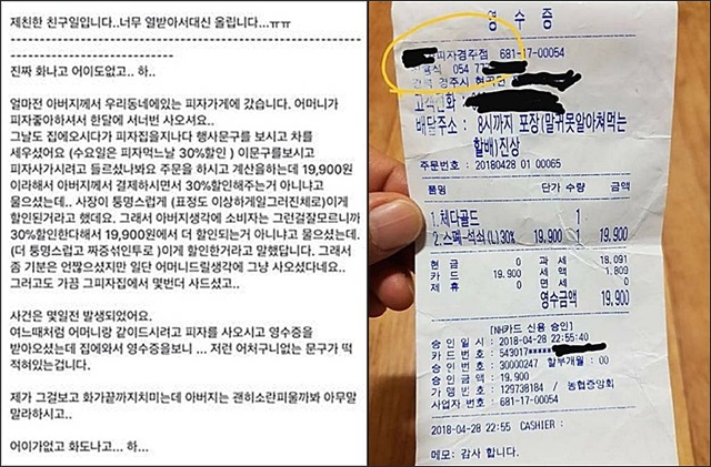 °Ô½ÃÀÚ´Â "¾ó¸¶Àü ¾Æ¹öÁö´Â µ¿³×¿¡ ÀÖ´Â ÇÇÀÚ°¡°Ô¿¡ °¬´Ù. ¾î¸Ó´Ï°¡ ÇÇÀÚ¸¦ ÁÁ¾ÆÇϼż ÇÑ´Þ¿¡ ¼³Ê¹ø »ç¿Â´Ù. ±×³¯µµ Áý¿¡ ¿À½Ã´Ù°¡ ÇÇÀÚÁý ÇÒÀÎÇà»ç ¹®±¸(¼ö¿äÀÏÀº ÇÇÀڸԴ³¯ 30% ÇÒÀÎ)¸¦ º¸°í ÇÇÀÚ¸¦ »ç°¡·Á°í µé·¶´Ù. ÁÖ¹®À» ÇÏ°í °áÁ¦¸¦ ÇÏ¸é¼ ÇÒÀÎÇØÁִ°Š¾Æ´Ï³Ä°í ¹¯ÀÚ, »çÀåÀº Åü¸í½º·´°Ô ÀÌ°Ô ÇÒÀεȰŶó°í Çß´Ù. ¾Æ¹öÁö´Â Àß ¸ð¸£´Ï±î 30% ÇÒÀÎÇÑ´ÙÇØ¼ 19,900¿ø¿¡¼ ´õ ÇÒÀεǴ°Š¾Æ´Ï³Ä°í ¹¯ÀÚ, »çÀåÀº ´õ Åü¸í½º·´°í Â¥Áõ¼¯ÀÎ ¸»Åõ·Î ÀÌ°Ô ÇÒÀÎÇѰŶó°í ¸»Çß´Ù. ±âºÐÀº Á» ¾ð¨¾ÒÁö¸¸ ÇÇÀÚ¸¦ ÁÁ¾ÆÇÏ´Â ¾î¸Ó´Ï¸¦ À§ÇØ ÀÏ´Ü ±×³É »ç¿Ô´Ù. ±×·¯°íµµ °¡²û ±× ÇÇÀÚÁý¿¡¼ ¸î¹ø ´õ »çµå¼Ì´Ù. »ç°ÇÀº ¸çÄ¥ Àü ¹ß»ýÇß´Ù. ¿©´À¶§Ã³·³ ÇÇÀÚ¸¦ »ç°í ¿µ¼öÁõÀ» ¹Þ¾Æ¿Ô´Âµ¥ Áý¿¡ ¿Í¼ ¿µ¼öÁõÀ» º¸´Ï '¸» ±Í ¸ø¾Ë¾ÆÃ³¸Ô´Â ÇÒ¹è, Áø»ó' ¾îó±¸´Ï ¾ø´Â ¹®±¸°¡ ÀûÇôÀÖ¾ú´Ù. ±×°É º¸°í Ȱ¡ ³¡±îÁö Ä¡¹Ì´Âµ¥ ¾Æ¹öÁö´Â ±¦È÷ ¼Ò¶õÇÇ¿ï±îºÁ ¾Æ¹«¸» ¸»¶óÇß´Ù"¸ç ¿µ¼öÁõ »çÁøÀ» ÇÔ²² ¿Ã·È´Ù.